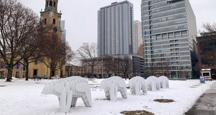 There’s a new public art installation in Cathedral Square Park, and it’s pretty neat! “Massimals MKE” is a group of life-size bear sculptures created by artist Jason Scroggin of Scroggin Studio. Massimals are described as “abstractions of animal forms built in the manner of massing study models produced in an architectural design practice used to explore the relationship between complex form, material and fabrication.” Oh, and thanks to lighting from Majic Productions, they’re lit up at night!