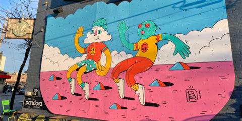While the work selected for the show clearly relies on similar visual sensibilities, the artists are linked also by their varied use of recycled materials. For Willadsen, found materials are recast as unconventional canvases, many of which lend a sense of depth and perspective to her urban structure subject matter, warping and stretching boundaries to achieve spatial illusions. Severson, on the other hand, chooses to display his mixed media record sleeve compositions on more traditional media, with simplified frames that complement his gestural arrangements. This only gives them more pop, more play in a two-dimensional space. Hibbard’s approach is a little more fluid. See chic acrylic lines in eye-catching hues on a shabby found pallet, a gold toy rocket ship balanced on a shelf within a painting, casting shadows that follow the painted element’s logic. I was partial to the work “PBR ME ASAP,” a funfair ode to the cheap beer that underwent an aggressive glow-up 20 years ago (a movement into which I once threw my full participation). It is in the color scheme of a child’s birthday party, and the iconic can on the right fits the tone without question. This is the beer that united the generations—a task that has become increasingly daunting—and to treat its representation with humor and a signature style feels like an appropriate overture to its history. Millennial dads: please hang this piece in your basement cocktail bar so the image can reach its full potential. And then invite me over to see it.