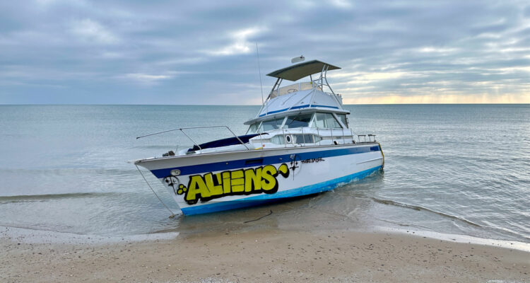 And so the saga of the Milwaukee Boat™ continues. Do we, Milwaukee Record, bear some responsibility for this latest development? After all, we’ve written about the boat a couple of times in the past and have posted approximately 8,000 photos of it on social media. Is this alien-themed paint job partially our fault? Nah, we haven’t been that weird about it, and something like this was bound to happen sooner or later. And writing “Aliens” on the side of this long-stranded boat is kind of funny.