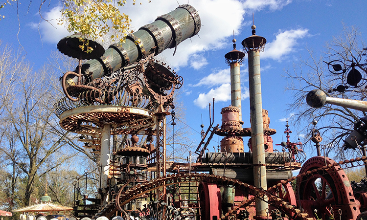 Meander around the grounds surrounding the Forevertron and you’ll be whisked into another world. Googly eyes and wide-mouthed smiles beam from creatures made of carburetors and bedsprings. Cheshire cats grin as they prance along the landscape, and a 70-piece bird band—yes, 70 scrap-metal birds wielding their individual musical instruments, complete with a 10-foot-tall wild-eyed conductor—infuse the park with artful magic. Everywhere you turn, there’s another mechanical friend to meet, another inventive sculpture to ponder.