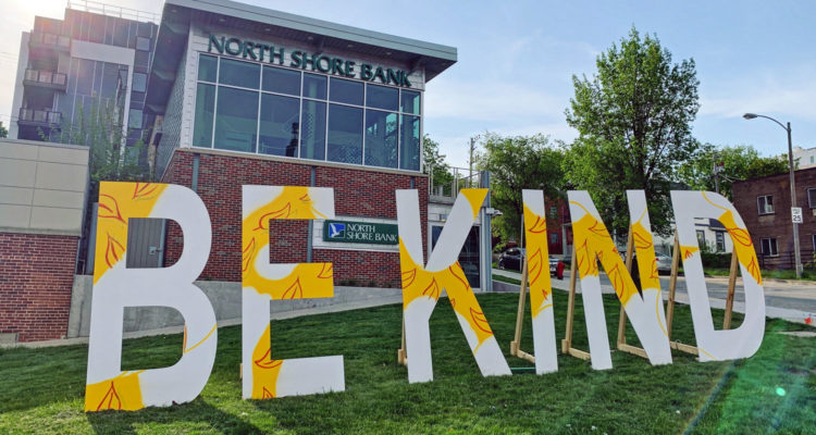 “As a community bank, we’re always looking for fun and positive ways to engage our neighbors. What better way to continue to spread our Bank on Kindness® message than a giant, artistically designed reminder on the popular Water Street,” says North Shore Bank District Manager and VP Cristen Baumann in a press release. “We hope this new art installation serves as a reminder to all to spread kindness, and we invite the community to come and take photos, say hi, and engage with us during our events this summer.”