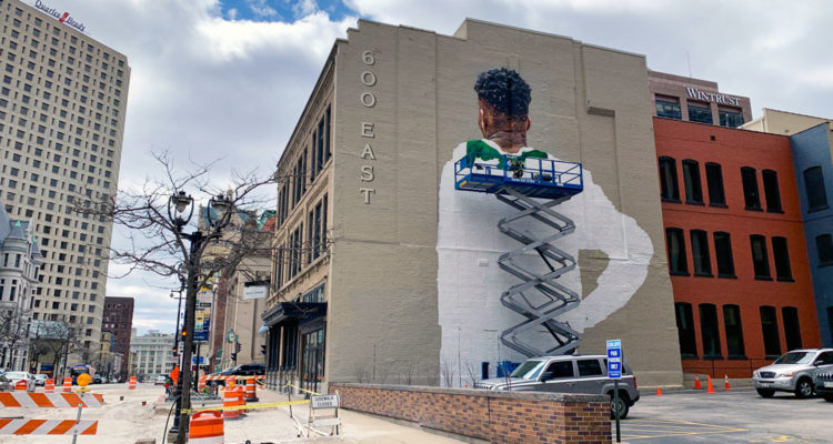 Well, it’s a Giannis mural, to be exact. The three-story, 54′ by 56′ mural is currently being painted on the east facade of the 600 EAST building, at 600 E. Wisconsin Ave. in downtown Milwaukee. It’s gonna be BIG.