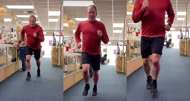 Freund, who’s been with Mike Crivello’s since 2011 and handles its social media, says the idea to run between 150 and 200 laps inside the camera shop is a natural extension of his everyday running routines.
