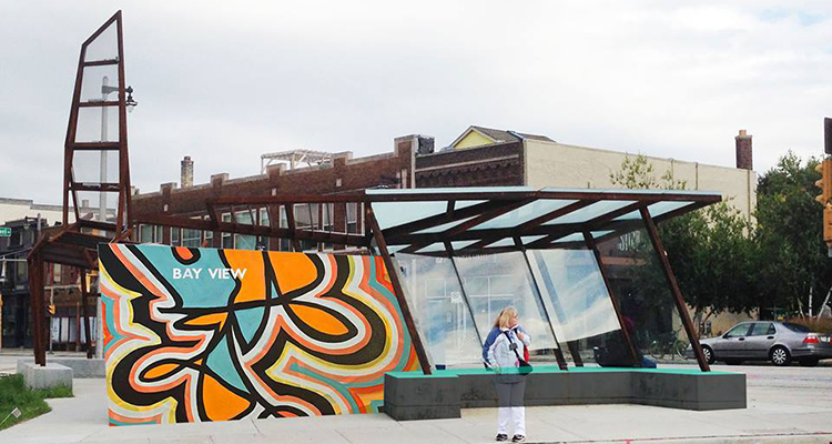 Recently, the public art installation that has elicited scrutiny from Milwaukee’s arts community has been a source of criticism from the public itself. Last month, a portion of the Art Stop’s prominent Lincoln Avenue-facing concrete wall was spray painted with graffiti. Earlier this month, the metallic E on the “Bay View” lettering was removed. In light of the vandalism on the cold, industrial design that’s been likened to “a scene in Inception,” Milwaukee painter and muralist Jeff Redmon is trying to convince Bay View’s powers at be to let him improve the Art Stop with the addition of, well, art.