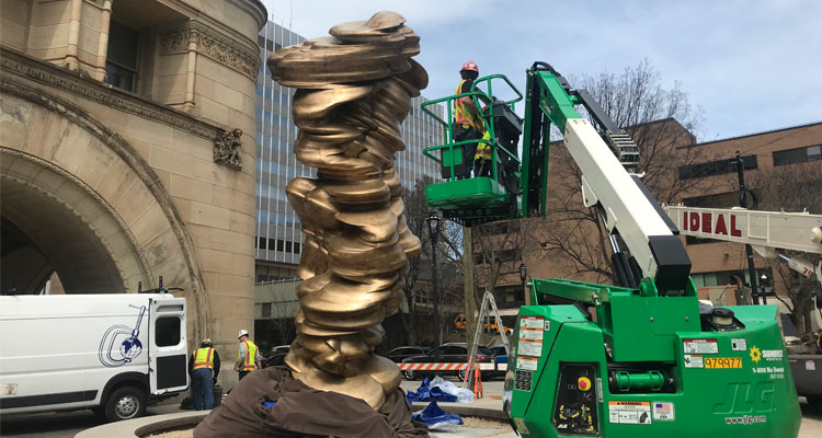 And hey! We shot a time-lapse video of yesterday’s installation, condensing five hours of work into less than a minute. (Thanks to the fine folks at Pabst Theater for letting us sneak up to their outdoor balcony for the bird’s eye view!) The second round of Sculpture Milwaukee, meanwhile, will be on view downtown from June to October 21, 2018. Installation is set to begin May 10.