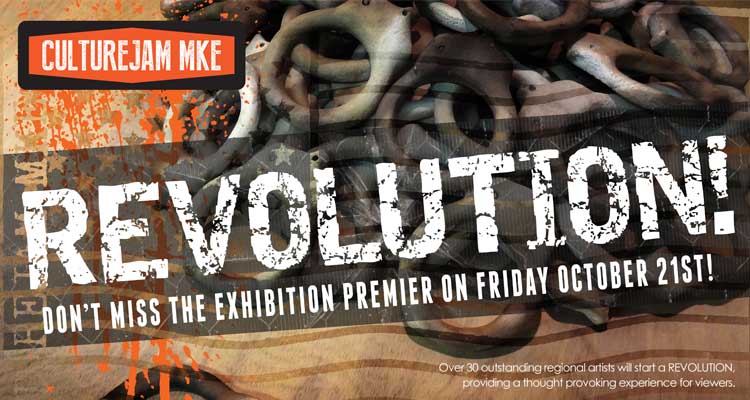 Revolution is the fifth installment in the provocative CultureJam MKE series. The no-holds-barred indie art series showcases outstanding regional artists challenging dominant notions of the relationship between human beings and their physical and mental environments. In this round curator Jeff Redmon brings together 30+ artists to start a much needed REVOLUTION, providing a thought provoking experience for viewers. “Artists must be at the frontline of progressive change.” – Waldek Dynerman