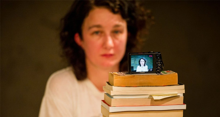 Indeed, “inging” wasn’t about the quality or content of the marathon speech; stripped of any and all filters between thought and expression, the physical act of speaking itself was the main attraction. Like a jazz musician, Durning riffed on her surroundings, occasionally dropped into repetitive grooves, and adjusted her trajectories when necessary. The few props included in the piece slyly served as counterpoints: a stack of books with a digital camera on top—its lens facing Durning, its view screen facing the audience—and a video projector showing a triad of past performances created a time-delayed feedback loop that played against Durning’s live, of-the-moment performance. “The thoughts are coming too quick,” she blurted out at another point, once again summing up her piece.