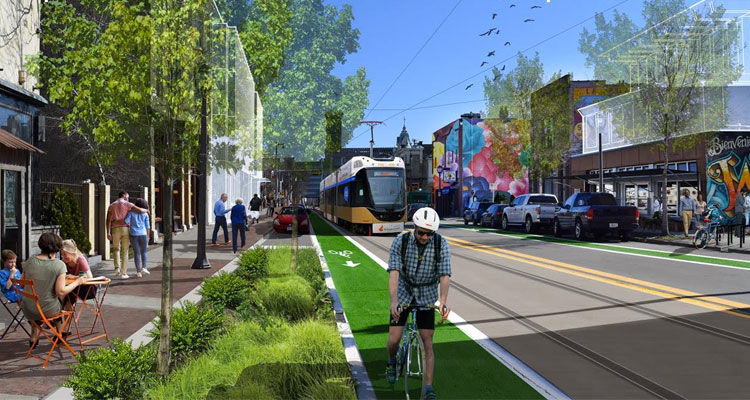 A rendering for Bronzeville depicts N. Martin Luther King Jr. Dr. receiving new development in context with existing buildings on the street. Traffic calming, green-painted bike lanes and medians are all depicted.