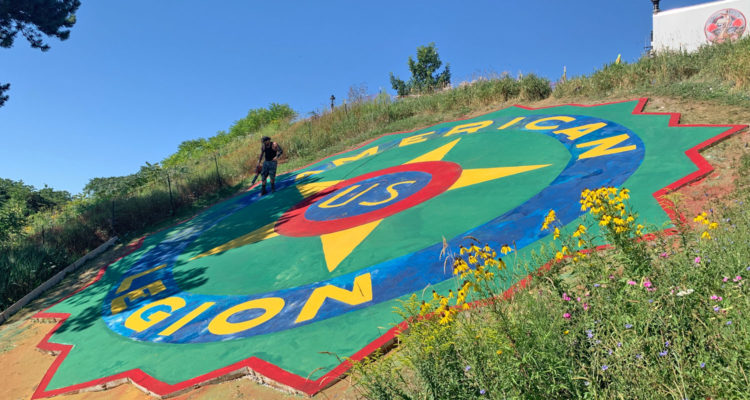If you’ve been to Kilbourn Reservoir Park lately—or if you’ve driven west on North Avenue, headed towards Riverwest, lately—you’ve undoubtedly seen restoration work being performed on that big American Legion emblem on the side of the Reservoir HIll. Veteran Ben Evenson and a crew from Decorative Concrete Surfacing (along with contractor Mid-City Corporation) have been working on the monument all summer, removing deteriorated colored glass, rebuilding the concrete base, and adding a new layer of colored quartz.
