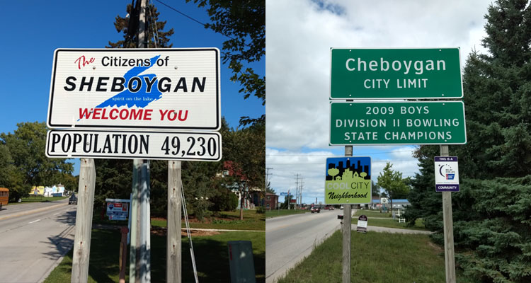 We realize there are multiple points of entry to both cities, so we may not have seen the best signs of this category for both. That said…come on, THE citizens of Sheboygan! Get over to Maple Lanes and practice a little.