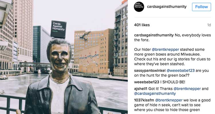 Cards Against Humanity—a.k.a. the edgy Apples To Apples that will inevitably find you explaining “bukkake” to your parents on Christmas Eve—is hiding a bunch of boxes throughout Milwaukee this week. The popular card game is posting pictures to its Instagram account revealing the locations of its new “green boxes,” which contain 300 new cards. The locations have so far included the Bronze Fonz, the lakefront, and the Pabst Mansion.
