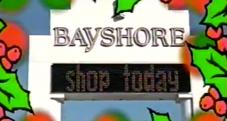 “With all your favorite stores and plenty of free parking,” says the announcer for the 17-year-old spot, “holiday shopping is a breeze at Bayshore.” A visit with Santa is also promoted, though it’s couched in a shameless plug for something called Kaboink!, a.k.a. “Time Warner’s club just for kids.” Nothing says “childhood magic” quite like sitting on Santa’s lap, telling him what you want for Christmas, and getting a Time Warner-branded coloring book.