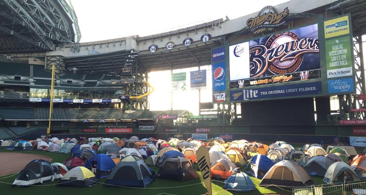 One night every summer, Miller Park transforms into the “Field Of Sweet Dreams.” The stadium’s outfield turns into a campground that let’s fans and urban explorers pitch a tent and take in the home field advantages of the place the Brewers play 81 times annually. In addition to the retractable-domed splendor of Miller Park, campers get to watch a Brewers away game on the center field video board, enjoy a post-game screening of a family-friendly film, take private tours of the visitor clubhouse and Bob Uecker’s radio booth, use a playground in the stadium, play catch on the field, hang out with the Racing Sausages and Bernie Brewer, hear a bedtime story read by Brewers players and coaches, get a baseball-themed morning wake-up call, eat a dinner buffet and evening snacks, have soft drinks (warning: there’s no alcohol served!) and breakfast, and receive “a special Brewers gift.”
