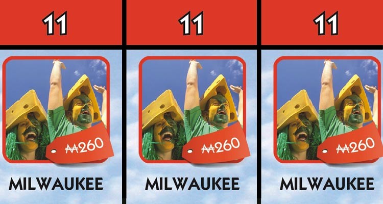 Which brings us to the recently unveiled “Here & Now” edition of Monopoly, an 80th anniversary edition that features U.S. cities (in the U.S. version, at least) in place of the game’s traditional properties. And hey! There’s Milwaukee in the mid-priced red section, one space past “Free Parking,” and sitting alongside Detroit and Boston! Neat! Oh, and we’re represented by two dudes wearing Cheeseheads and green-and-gold face paint watching a Packers game at…um…er…uh…maybe in someone’s backyard or something? Outside a bar? In the woods? Huh.