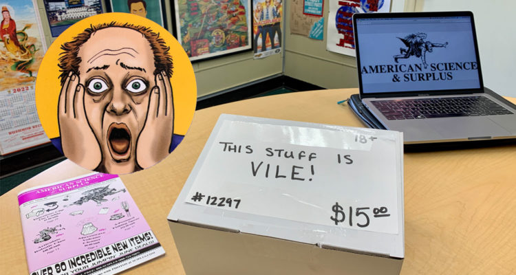 Everyone knows that American Science & Surplus is a wonderland of weird and wacky stuff, a place for novelty items, bins of ball bearings, and random strips of velcro in case you need random strips of velcro. But did you know that AS&S occasionally orders stuff “too naughty” to display on store shelves, and will occasionally toss that stuff into unmarked boxes and sell them (to folks 18 and older, of course) as “Naughty Mystery Boxes”?