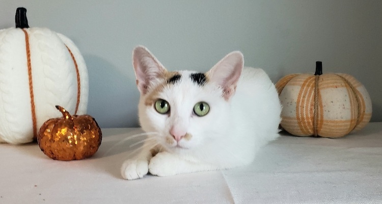 CC is content to sit near a window and watch the world going by. If you want snuggles and to pet her, rub your fingers together and she’ll come running. This happy cat purrs all the time. She will make air biscuits with her paws when you hold her and she corkscrews her tail when you scratch her butt just right.