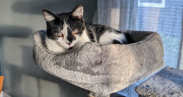 Now a little about those eyes: Life outside was rough and due to lack of care, she has some corneal scarring that limits her eyesight a little. Don’t worry, she gets around just fine. Further issue is easily managed with supplemental lysine powder mixed in her food to boost her immune system. Easy-peasy! If you’re looking for loving feline companion with a beautiful black and white coat, Hope is your girl.