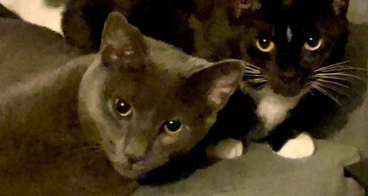 These two are inseparable, often found snuggling up together. When one wanders away from the other, you will hear tiny meows of “Where are you?” The other responds mewing, “I’m over here.” It’s very sweet.