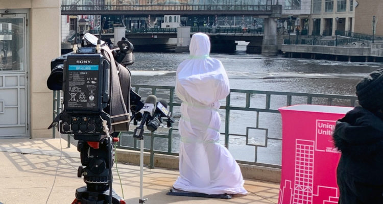 Yes, the once-controversial statue was re-unveiled at a chilly ceremony Friday afternoon, emerging from a shroud-like burial cloth and once again assuming its throne on the downtown RiverWalk, right next to that empty Chinese restaurant. The statue had been undergoing some restoration and maintenance work from Vanguard Sculpture Services. No more painted blue jeans! No more painted T-shirt! Now, the statue has a more natural, more bronze-like sheen. It looks pretty nice!