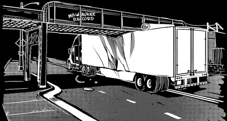With the help of Redwall Screen Printing and artist Andy Tyra, we’ve created a brand new shirt design that pays truck-demolishing tribute to a destructive point of local interest. This lovely illustration of Milwaukee’s hungriest railroad bridge is printed on black Bella Canvas unisex T-shirts in white ink.