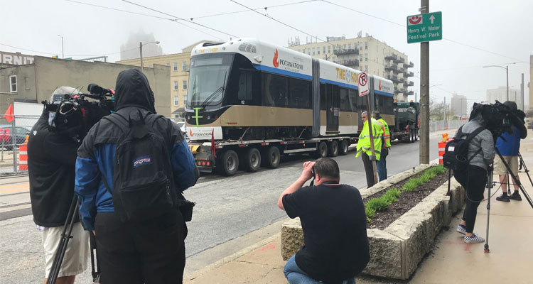 Monday morning, in an event akin to the release of The Godfather Part II, The Empire Strikes Back, or Ernest Saves Christmas, the SECOND of Milwaukee’s new streetcars arrived downtown. Like its predecessor back in March, the 67-foot-long, 83,000-pound streetcar came in after a days-long flatbed truck trip from Brookville, Pennsylvania. It was greeted by police, Department of Public Works crews, every news organization in town, and a lot of people taking pictures. Here are pictures of those people taking pictures.