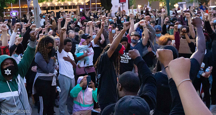 Here are tons of powerful images from photographer Meg Strobel, preceded by two lengthy Facebook streams from me (Matt), all documenting Monday’s protests. Black Lives Matter. Justice. Now.