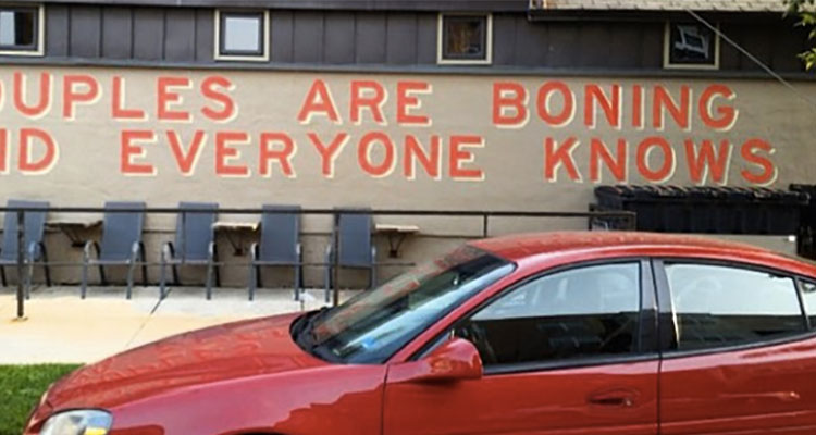 Last month, we told you the story of Fink’s “COUPLES ARE BORING AND EVERYONE KNOWS IT” sign, painted by Filthy Freehand artist Sarah Linkus. Loved by some and hated by others, the piece got people talking and incited speculation regarding its intended meaning. On the weight of the piece’s response, Fink’s even started accepting submissions for a new phrase that would appear on its exterior wall. Wednesday morning, someone took changing the phrase into their own hands by altering Linkus’ work, ironically, using some filthy freehand of their own.