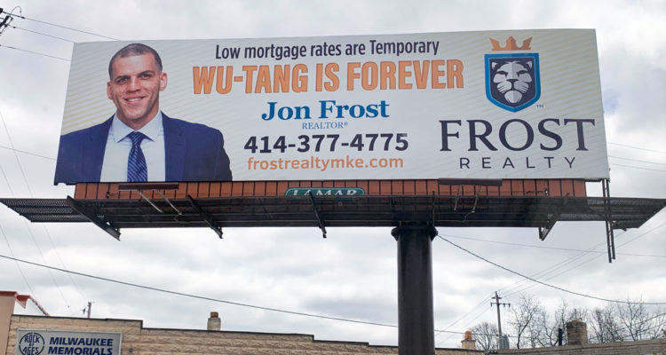Take a break from diversifying your bonds and listen up: Milwaukee realtor Jon Frost is the Genius/GZA behind a new billboard that reads: “Low mortgage rates are Temporary. WU-TANG IS FOREVER.” A mock-up of the billboard has been making the rounds on social media for the last few weeks. Well, the real thing is finally up—on the corner of Appleton and Burleigh, to be exact—and it’s great.