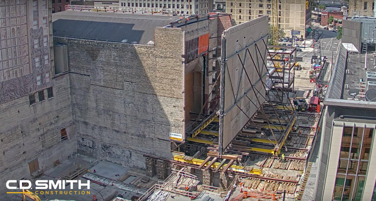 • Earlier this week, while the rest of us were sitting in chairs and staring at screens, crews from C.D. Smith Construction successfully moved a brick wall that clocked in at 1.2 million pounds, 86 feet tall, and 100 feet long in downtown Milwaukee. Why? It was part of the $89 million transformation of the old Grand Warner Theatre into the new home for the Milwaukee Symphony Orchestra. In order to accommodate a larger stage for the MSO, the wall (built in 1931) was slowly moved approximately 35 feet to the east.