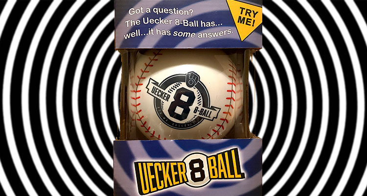 This past Sunday, all attendees at the Milwaukee Brewers/Cincinnati Reds game at Miller Park were gifted a truly incredible trinket: a Bob Uecker-themed magic 8-ball. Falling on the scale of promotional-item coolness somewhere between the Bob Uecker Talking Alarm Clock and the 1982 Paul Molitor replica jersey, the Uecker 8-Ball invites users to ask it a question, shake it up, look at the weird little floating triangle thing in the back, and receive a pithy answer. “Everything you want in an 8-Ball…and less,” reads the box, which sums it up nicely.