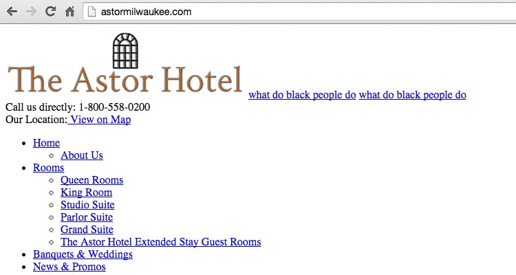 The Astor Hotel has been a Milwaukee institution for nearly 100 years, welcoming visitors and locals alike with a touch of class and old-school charm. Its website? Not so much. Last Friday, a user on the Milwaukee subreddit (yeah, we’re sourcing this from Reddit; deal with it) discovered that the hotel’s website had fallen victim to some offensive/confusing cyber graffiti. In addition to being more or less broken, astormilwaukee.com was tagged with the lines “what do black people do what do black people do.” Clicking on the text led to a spam website. (We do not recommend clicking that link.)