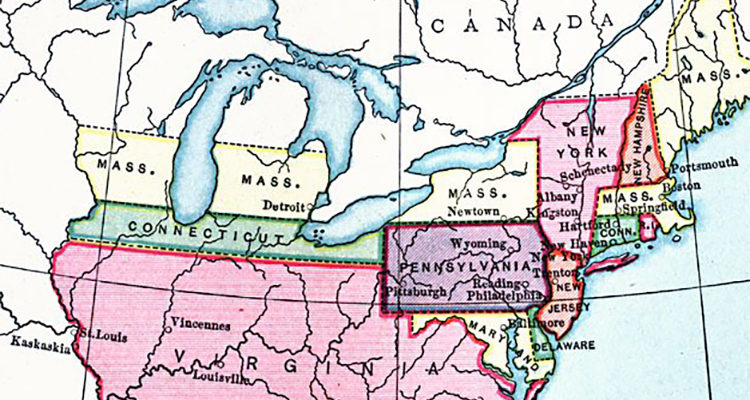 It’s super odd to see a city called “Wyoming” in late-18th century Pennsylvania, a thin strip of land crossing the top of Indiana and Illinois (including Chicago) that’s classified as Connecticut, and much of Michigan and Wisconsin masquerading as Massachusetts. Wanting to both verify this bizarre map and learn more about half of the state’s apparent Massachusetts roots, we dug a little deeper and here’s what we found out.