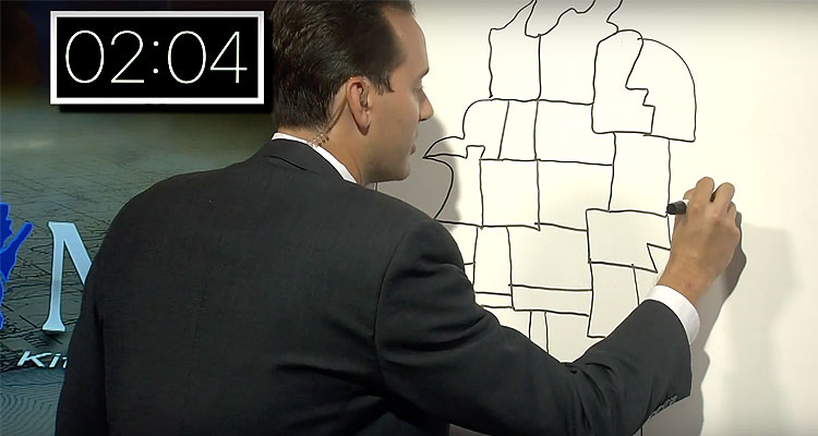 Right? There are plenty of people who can bust out the “draw a state-by-state map of the United States” party trick, but a county-by-county map of a single state? Weird, wild stuff. “Forest and Florence…look at my hand shaking, I’m so nervous,” Kittilstad says at one point. Oh yeah, he calls out the names of the counties as he draws them! And he pulls it off with only seconds to go! And there’s a drum accompaniment! Hastily sketched but unnervingly accurate outlines of Dodge, Winnebago, and Calumet counties have never been so thrilling.