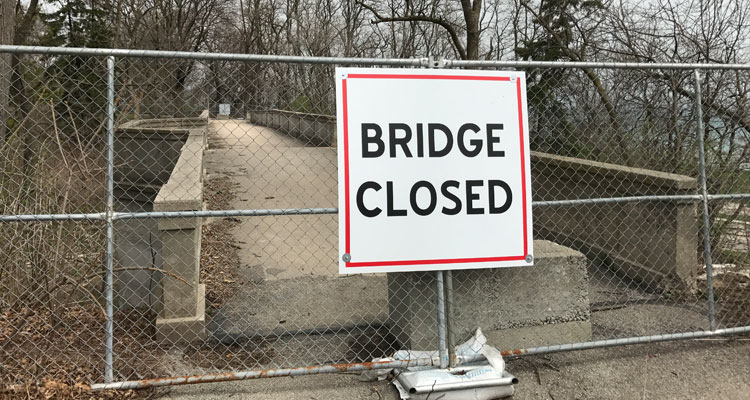 Well, for starters, it’s closed. Located near Bartolotta’s Lake Park Bistro, the historic footbridge was first closed for “emergency repairs” in 2014, following the discovery of cracks in the concrete and soil erosion around the end supports. (The section of Ravine Road below the bridge, which connects the lakefront and Lake Park’s bluff areas, was closed as well.) Large concrete blocks were stationed on both ends of the bridge, warding off bicyclists and folks not crafty enough to squeeze between the blocks. In recent months a full chain link fence has been installed. In all, the bridge has been in some state of closure for nearly three years.