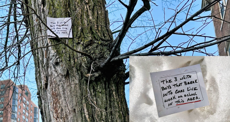 Those signs soon turned into cards—dozens upon dozens of them, now mass produced on a printer and stapled high up in the trees. “The 3 white boys that break into cars live work or school in this area,” read the slightly modified and more specific cards.