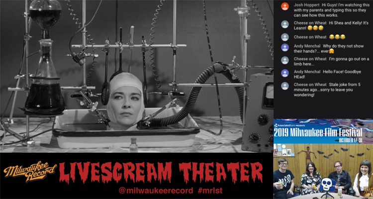 As part of the 2019 Milwaukee Film Festival (tickets are on sale NOW!), we’re spending the entire month of October bringing you a live viewing party of classic public domain horror and sci-fi films. For last night’s LiveSCREAM episode, Milwaukee Record‘s Matt Wild (that’s me) was joined pals Kelly Bolter, Shea Frevele, and Ian Olvera. Kelly wowed the group with her Star Trek knowledge, Shea wowed the group with her decapitation knowledge (!), Ian brought the house down with some Riverwest jokes, and Matt spent 90 minutes trying to get through a pathetic story about the time he was in 1st grade and he thought a “lavatory” was actually a “laboratory.” Plus, online commenters watching along chided Matt for picking such a tawdry flick. Sorry!