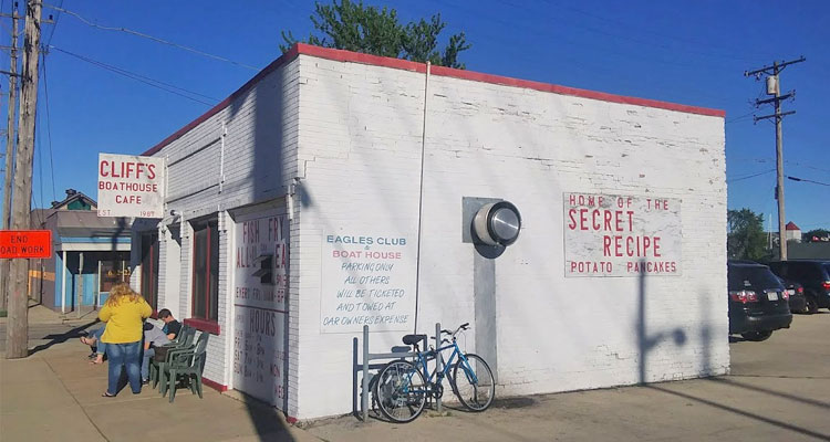From the moment I spotted the building, I had a feeling that Cliff’s Boathouse Cafe (301 Hamilton St., 262-633-1767) had been a good choice. On one hand it is unassuming, with its diminutive size, solid-white paint job, and hand-painted signs, but at the same time the red-lettered signs loudly proclaim the goodness within: “HOME OF THE SECRET RECIPE POTATO PANCAKES” and “FISH FRY ALL-U CAN EAT.” Inside, mounted fish such as perch, salmon, and blue marlin cover the wood-paneled walls, as does a patchwork of other things, like sports memorabilia, an advertisement for a lost dog, some old pictures, a piece of paper reminding everyone that drinking during a pregnancy can cause birth defects, and a chalkboard sign saying “CASH ONLY.” A large bell hangs on the door and rings when a customer comes in. The place actually feels like a boathouse, or maybe a juke joint, and there are less than 10 tables in all.