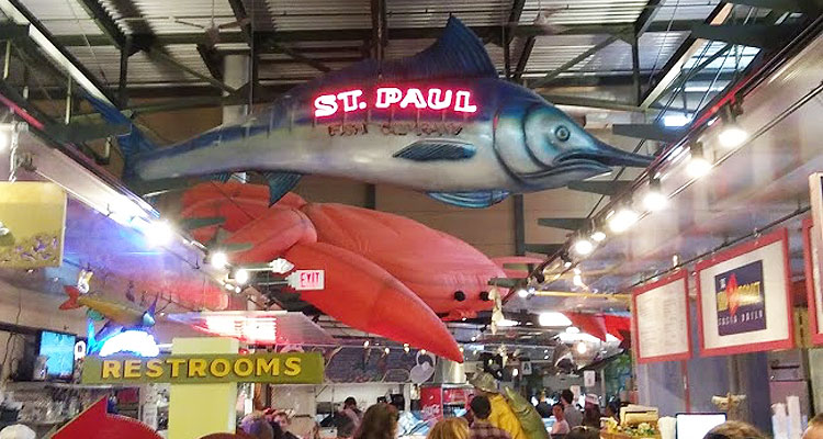 Located in the southeast corner of the Milwaukee Public Market, St. Paul Fish Company has been around since 2005, being one of the original businesses in the market. It is both a full-on restaurant and a fresh seafood center. St. Paul has an inside dining area, an outside bar covered with a thatched roof, an oyster bar, a case with fish and seafood on ice, a case with prepared seafood dishes, and a live lobster tank, to name a few things.