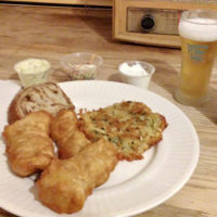 Naturally, I ordered the all-you-can-eat cod with potato pancakes. Clam chowder was also available ($2.50/cup or $4/bowl), and I ordered a cup of that as well. The chowder had a thin, broth-like base, with very small pieces of carrots, celery, onion, and clam, that perhaps had been brunoised or chopped with a food processor. The flavor and texture were balanced, not striking out far from the parameters of what is expected of clam chowder.