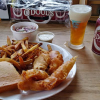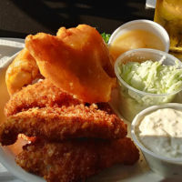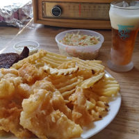 It wasn’t long before the rest of the food came. Six pieces of cod leaned on each other, filling up one side of the plate. A thin breading covered their hearty morsels, giving them a ribbed appearance. The fish was relatively mild in flavor: the breading had enough seasonings to be seen, but not to be heard loudly. What can be said of all the fish I ate here is that it was consistent (except for one piece that was a little rubbery at its end, but not enough so to derail this observation). Relish-heavy with small red bell pepper chunks sprinkled in, the tartar—of which there were two containers at the start—also was mild, but with enough sweetness and tanginess to peek through and get noticed.