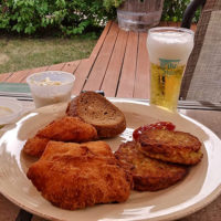 Potato choices are homemade potato pancakes or hand-cut french fries. Actually, there may be other choices too, but when I was making my order I lost all my self-control and immediately asked if there were homemade potato pancakes, and never bothered to ask about other options. What kind of attention to detail did you expect after 16 months away from this?