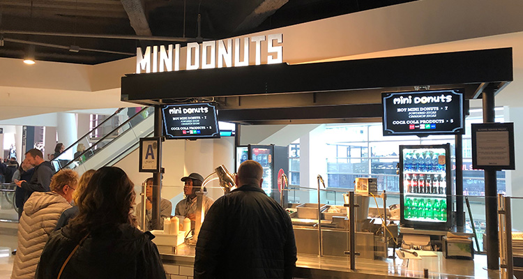 Just some of the local culinary touches Fiserv Forum features include Klement’s Sausage, Sobelman’s, The Laughing Taco, Gold Rush Chicken, Iron Grate BBQ, FreshFin Poké, Cedar Crest Ice Cream, Colectivo Coffee, Drink Wisconsinbly, Milwaukee Pretzel Company, and El Rey. It’s already been a vast improvement compared to BMO Harris Bradley Center’s paltry local concession offerings. Sil’s Mini Donuts was one of the few Bradley Center points of Epicurean pride and, sadly, one of the stands that didn’t make the move to the Fiserv Forum. But even though Sil’s isn’t at the new digs, the miniature donut tradition lives on at the new arena at a stand that’s simply called “Mini Donuts.”