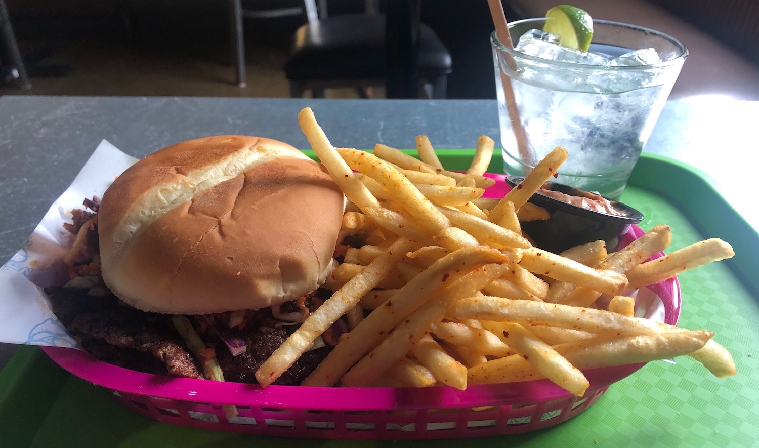 Fox Den quietly started serving some of its specialty smash burgers and eclectic collection of side dishes out of Great Lakes Distillery this fall. With the waters appropriately tested and cravings created for oodles of distillery customers, the restaurant opened in full last weekend. At this point, customers can choose from eight inventive and indulgent smash burger creations. There are three beef-based burger varietals, including the “Chimi Hendrix Experience”—pictured directly above—that’s topped with a decadent cheddar and chorizo spread, a fresh Dominican slaw that’s rich in chopped vegetables and raisins, and as the name might suggest, a slathering of chimichurri between a mushy bakery bun. It’s massive, it’s messy, and it pairs extremely well with a cocktail (such as the gin and tonic pictured up top).