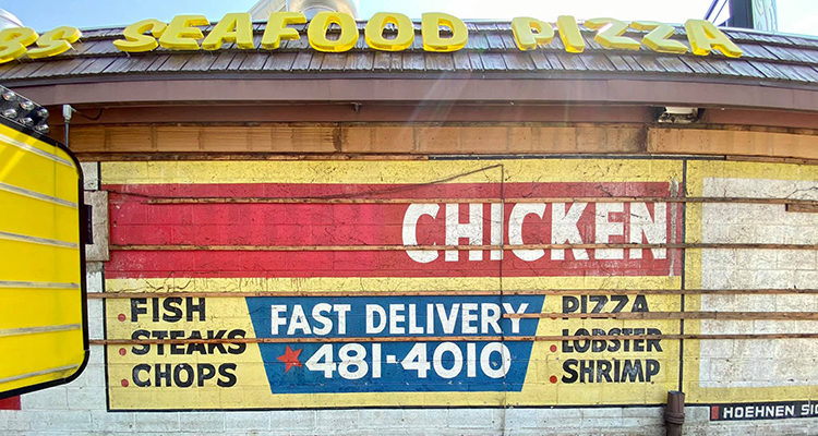 The signs were originally painted for the previous tenant, Golden Chicken, sometime in the late 1950s. Levin says the word “Golden” was painted over around 1960, when the business’ name was changed to Gold Rush. You can also see a list of Golden Chicken’s specialties, including long-gone menu items like lobster and steak. Miraculously, the phone number listed at the bottom of the sign is still the phone number for Gold Rush Chicken.