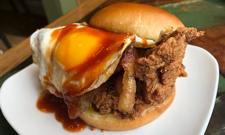 Fried chicken sandwich with “thicc” cut bacon, fried egg, maple bacon sauce, and honey butter