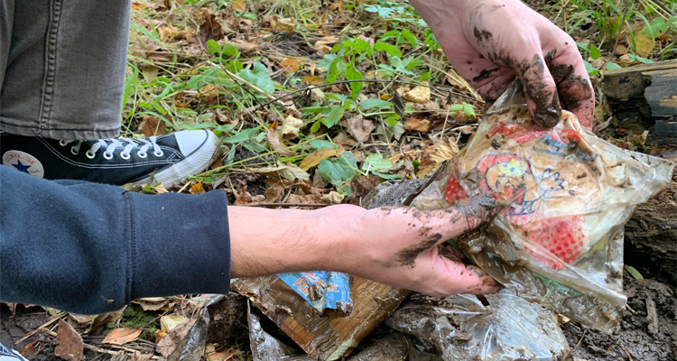 And that was that! I unearthed the free George Webb burger I had buried in the woods. I gathered the entire gloopy mess and tossed it in a garbage can. My kid had a fun time taking pictures.