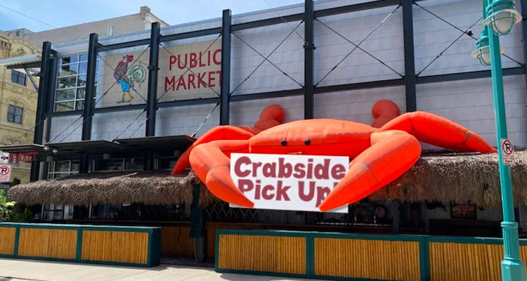 Vendors such as St Paul Fish Company are showcasing their sense of humor during the opening, calling their to-go service “Crabside Pickup” in reference to the repurposing of their iconic inflatable crab which usually suspends above their space inside the market. The crab is now temporarily displayed on the rooftop of their outdoor Palapa bar area, which will be the carryout location for the popular fish emporium.