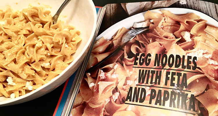 Aside from an abundance of fried chicken recipes and an informative graphic that details the many treasures “a fucking 270-pound tuna” holds, the glut of Fuck, That’s Delicious’ entrees are of the pasta variety. I was still incubating a chicken dinner from Gold Rush this particular day, so for the sake of shaking things up and, if I’m being honest, with both price and simplicity also in mind, I selected a noodle dish for dinner. Swayed by the description (“Now this is a fucking pasta”) and the mouthwatering accompanying image, I set out to make Bronson’s recipe for Egg Noodles With Feta And Paprika.