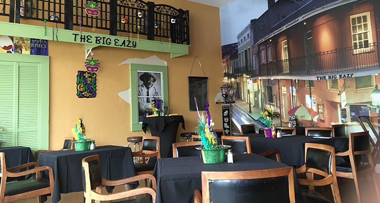 The space: Nowhere quite epitomizes thematic on-the-nose decor more thoroughly or endearingly than Big Eazy. The unsubtle bombardment of NOLA love starts with Venetian masks and beaded necklaces festooning the makeshift balcony built in to the restaurant’s southern wall. Another wall is entirely covered with a gigantic Bourbon Street print. Completing the ambiance are shimmering, ribbon-filled top hats serving as centerpieces, and, of course, some requisite Saints gear. The aesthetic might seem a little boisterous, but as we came to learn, it speaks to the owner’s sincere earnestness and pride in his home and his cooking.