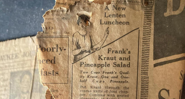 On Thursday, February 18, 1926, the Milwaukee Journal ran what can generously be considered a “recipe” for “A New Lenten Luncheon” for its readers. Since Lent and Christmas are pretty much the same shit (“Jesus good!”), we figured this near-century-old dish called “Frank’s Kraut and Pineapple Salad” would also be appropriate for December dining.